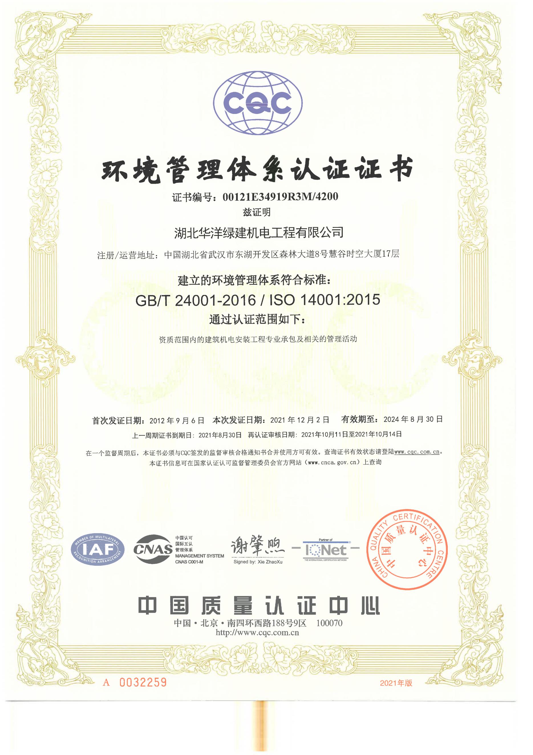 環(huán)境管理體系認(rèn)證證書(shū)